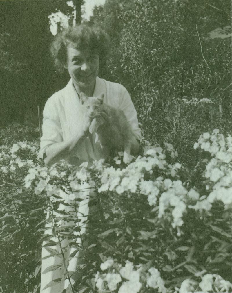 ABOVE: Georgia Hoyt in one of her gardens here, with a feline friend. She was an animal rights activist, being a founding member of two animal humane societies. The Michigan Animal Rescue League, still operating in Pontiac, had its first meeting in this house.