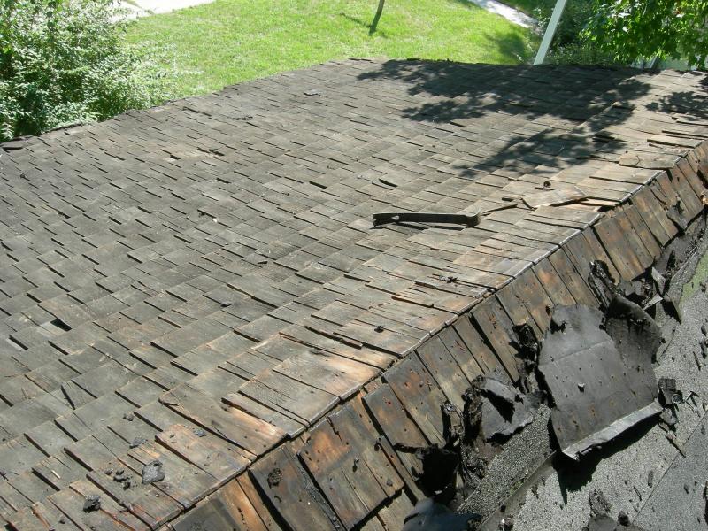 These are the original cedar shingles on the front portion of the house that was moved here in 1867. These shingles date to around 1840. Altogether, there were six layers of roofing on this portion of the house when I put the new roof on in the summer of 2007. There was also a small chimney in the center of this roof that was unsupported to the ground causing the roof structure to sag. It was obsolete and so it was removed during this roofing project. Improvements to the house's exterior and interior continue.