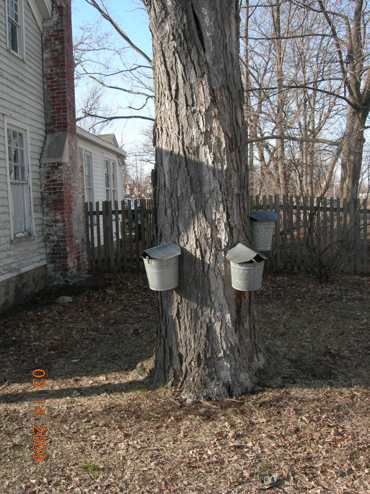 ABOVE: March, 2009, and the sap is running. There are two very old sugar maples here, and one about thirty years old. I have eight buckets on trees as of today, March 14, 2009 and the sap is running well.